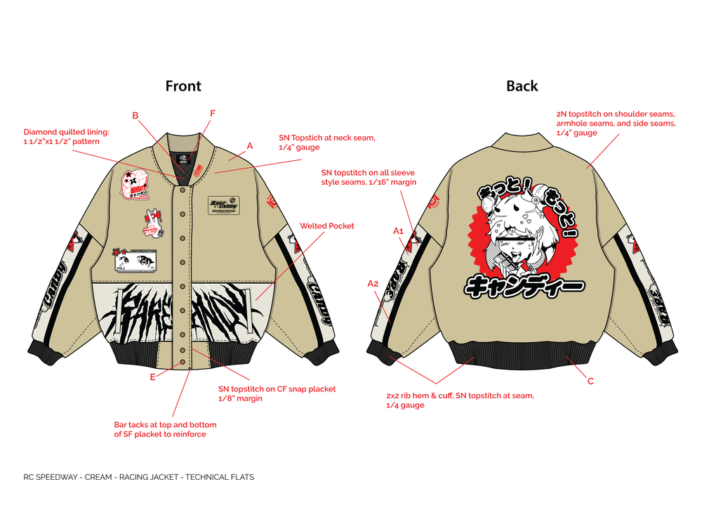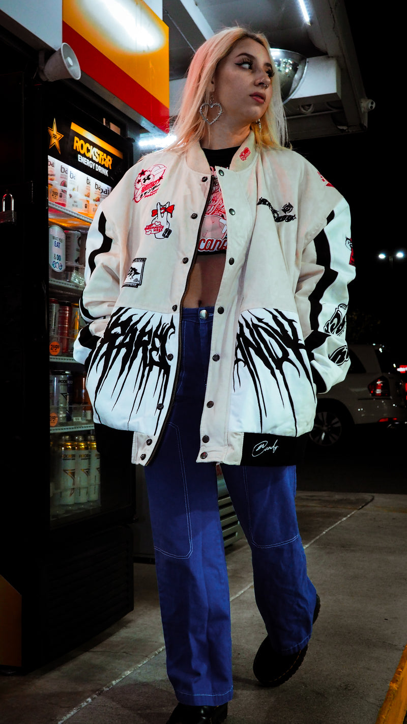 Fully lined racing jacket featuring custom embroidery and color-blocked paneling. Inspired by motorsport energy and subcultural uniform codes.