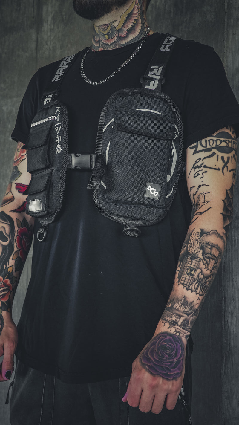 Sculptural nylon rig bag with oversized pockets, custom webbing, and PVC branding. A utility-forward statement with modular storage and a hard-shelled silhouette.