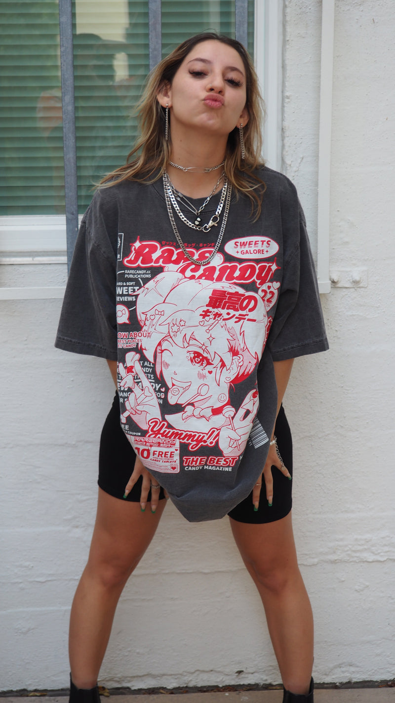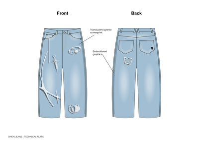 Oversized denim jacket with screenprinted graphics, strap-and-button sleeve detail, and a washed finish. Clean structure meets playful utility.